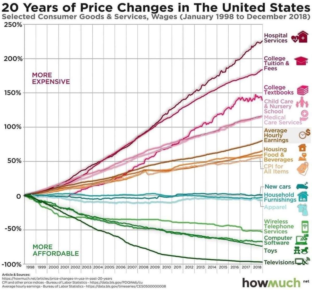 So maybe the real reflection of the above graph is that anything that requires higher intellect but cannot be mass produced (both conditions fulfilling) – the cost has risen more – see college education, hospital services… even if intellect is required but if that can be mass produced by a machine once set – the prices drop (see software, TV, etc)…